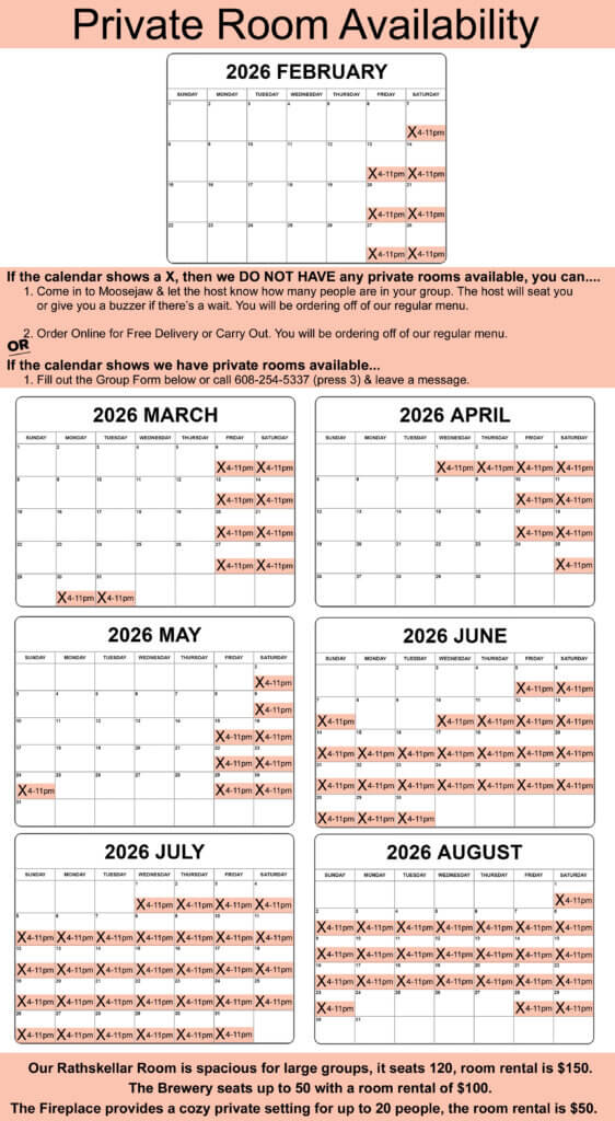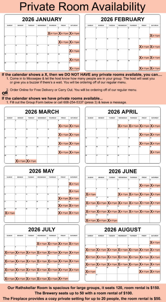 1. Come in to Moosejaw & let the host know how many people are in your group. The host will seat you or give you a buzzer if there’s a wait. You will be ordering off of our regular menu. We do not take reservations.