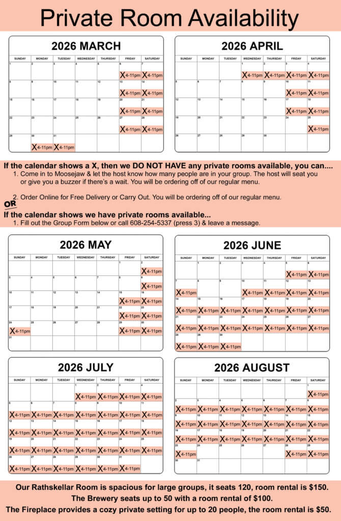 Download/Print the Moosejaw Large Groups Menu. Please keep in mind the menu selections shown below are just the most popular, if you have custom menu ideas just speak with Group Sales.